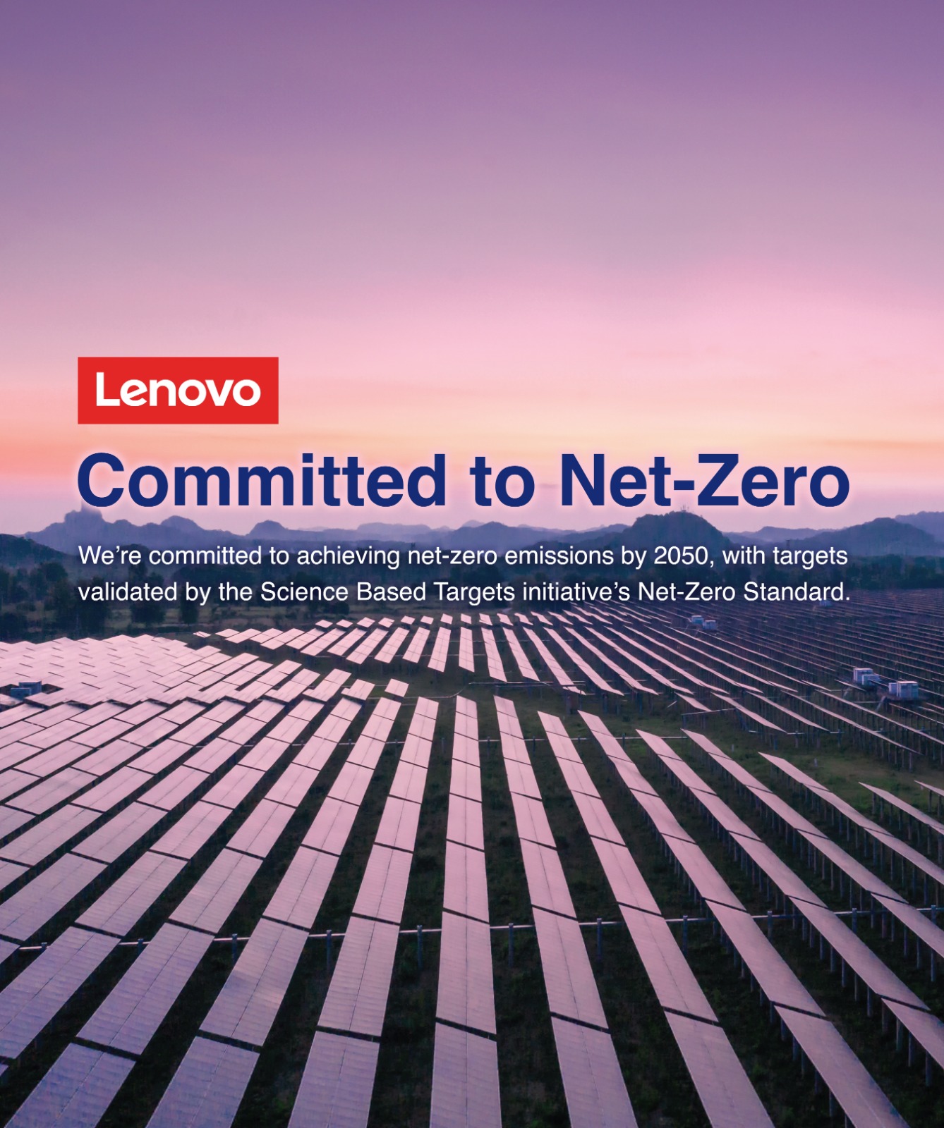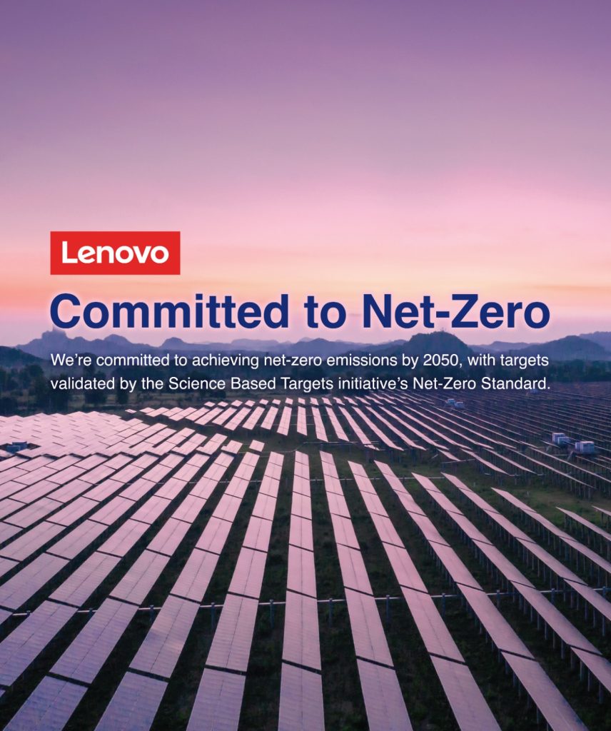 Lenovo ໄດ້ຕັ້ງເປົ້າໝາຍໃຫ້ກາຍເປັນບໍລິສັດ Net Zero ພາຍໃນປີ 2050. ໂດຍເປົ້າໝາຍດັ່ງກ່າວໄດ້ຮັບການກວດສອບ ແລະ ຮັບຮອງໂດຍ Science Based Targets Initiative (SBTi) ເຊິ່ງຈະໄປສູ່ຄວາມເປັນ Net-Zero ໃນປີ 2050 ນັ້ນ, Lenovo ຍັງໄດ້ວາງເປົ້າໝາຍໄລຍະສັ້ນຕ່າງໆເຊັ່ນ: ຫຼຸດຜ່ອນການປ່ອຍອາຍພິດເຮືອນແກ້ວໃຫ້ໄດ້ 50% ໃນປີ 2030; ຕັ້ງເປົ້າໃນການພັດທະນາ ແລະ ປັບປຸງປະສິດທິພາບການໃຊ້ພະລັງງານຂອງອຸປະກອນໃຫ້ກິນໄຟໜ້ອຍ 50% ໃນເດັສທັອບ ແລະ ເຊີບເວີ ແລະ 30% ໃນແລັບທັອບ ເຊິ່ງປັດຈຸບັນຜະລິດຕະພັນຂອງ Lenovo ມີປະສິດທິພາບດີເລີດໃນດ້ານການຊົມໃຊ້ພະລັງງານ ໂດຍໄດ້ຮັບມາດຕະຖານປ້າຍສິ່ງແວດລ້ອມ EPEAT ລະດັບ Gold ແລະ ການຢັ້ງຢືນ ENERGYSTAR ໃນຜະລິດຕະພັນ ThinkPad ທັງໝົດ.