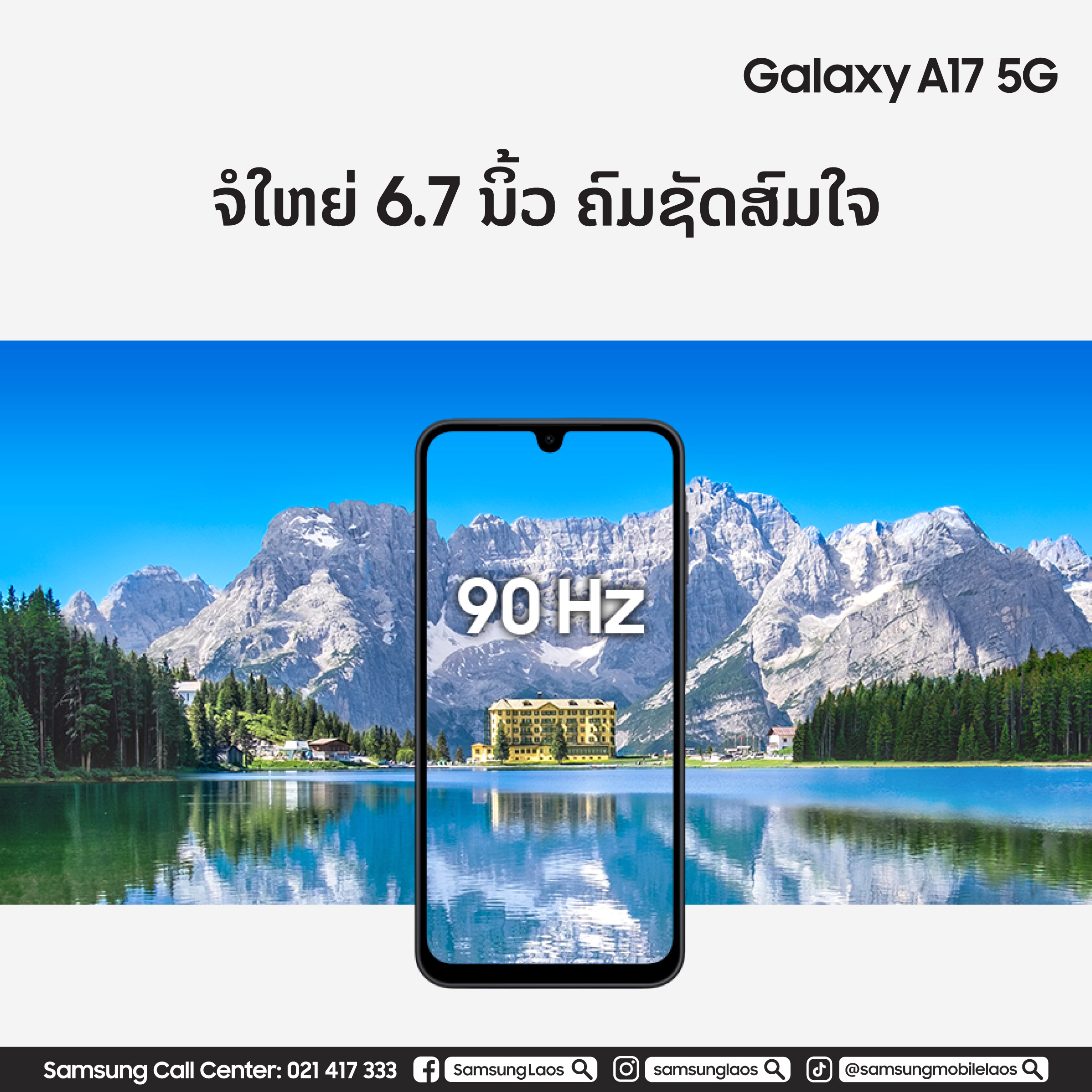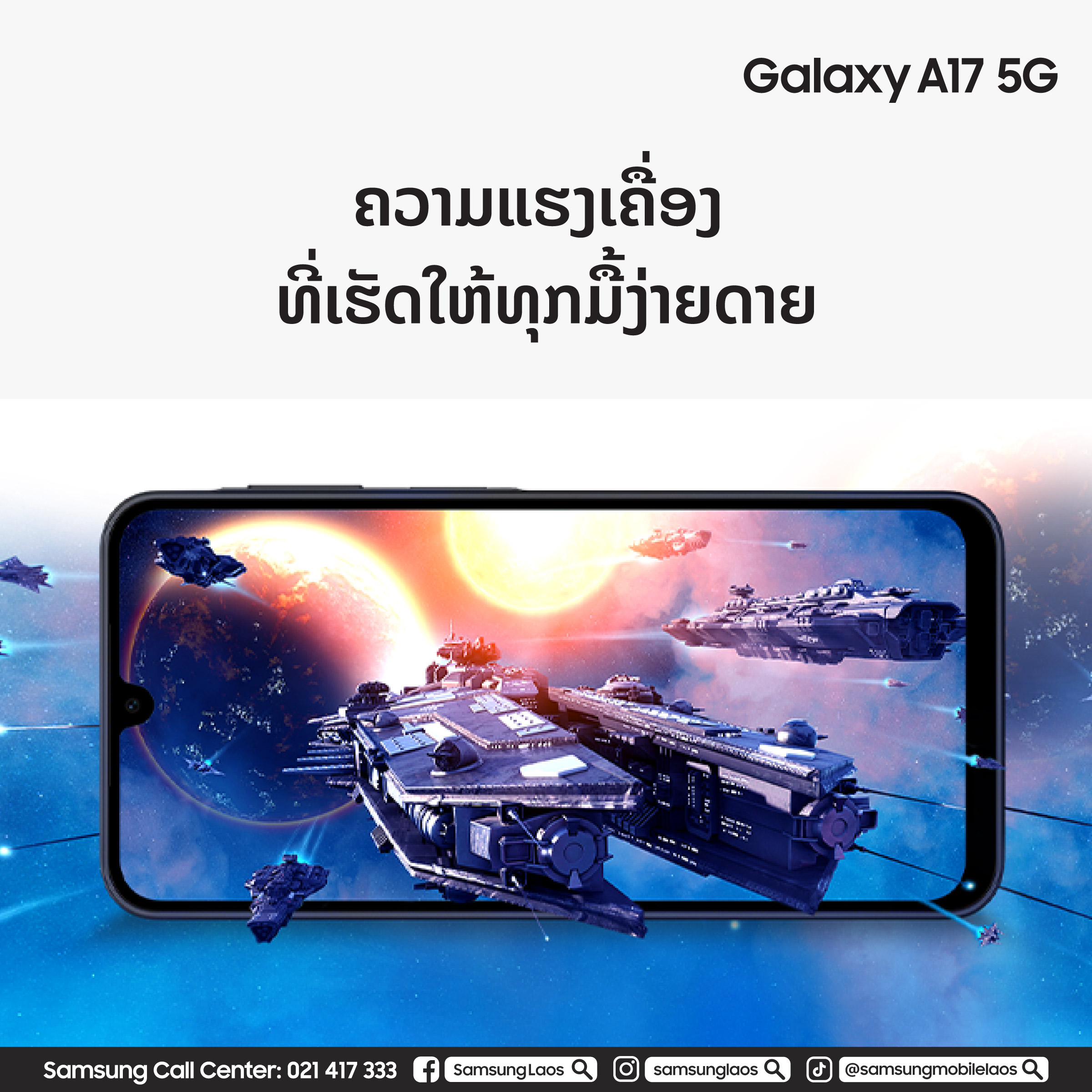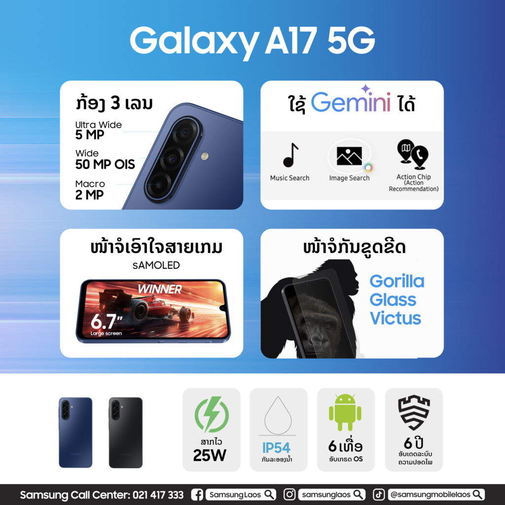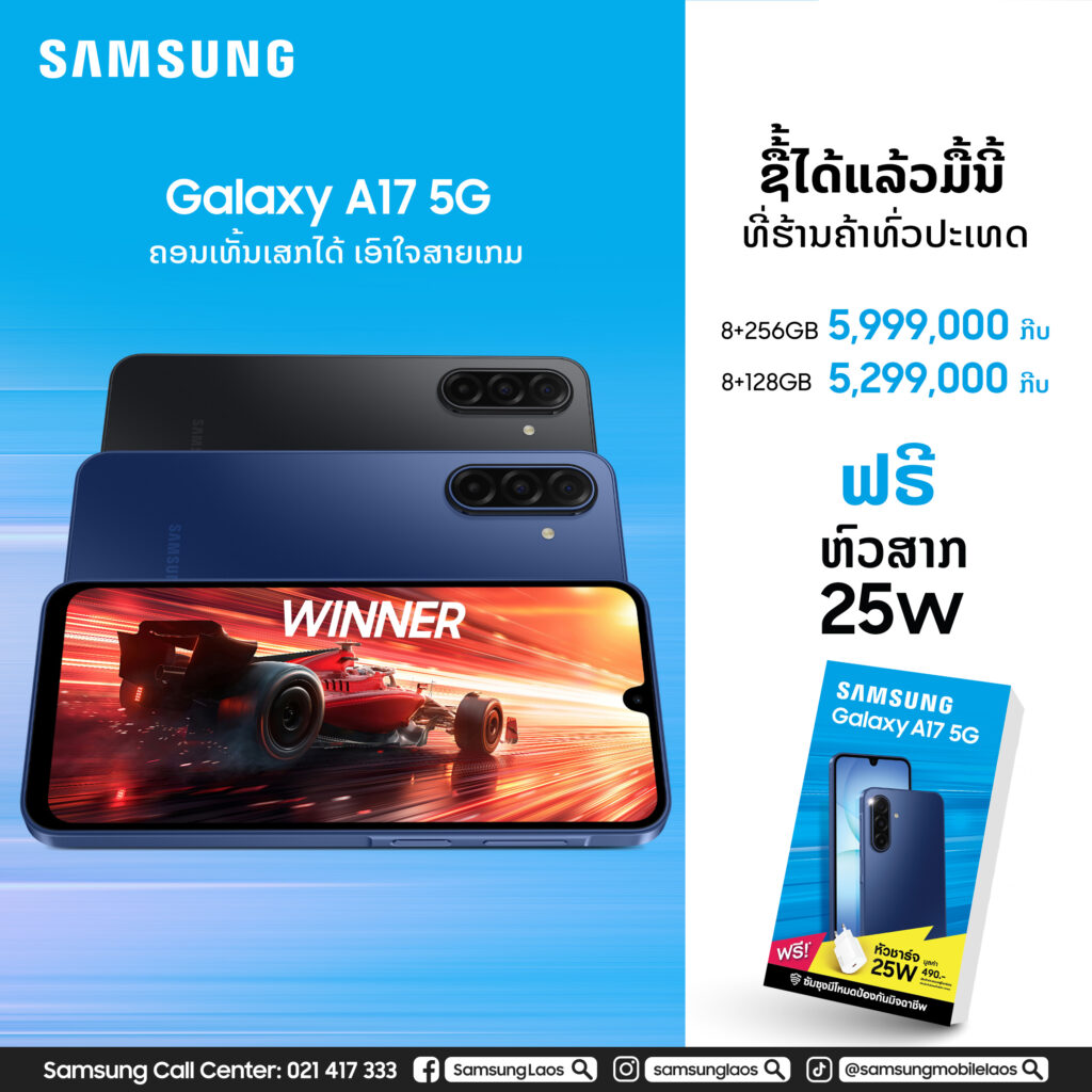 ນະຄອນຫຼວງວຽງຈັນ, ສປປ. ລາວ – ວັນທີ 27 ສິງຫາ 2025 – ບໍລິສັດ ຊຳຊຸງອີເຣັກໂທຣນິກ ຈຳກັດ ປະກາດການວາງຈຳໜ່າຍສະມາດໂຟນສອງຮຸ້ນໃໝ່ຢ່າງເປັນທາງການໃນ ສປປ. ລາວ ຄື: Samsung Galaxy A07 ແລະ Galaxy A17 5G.