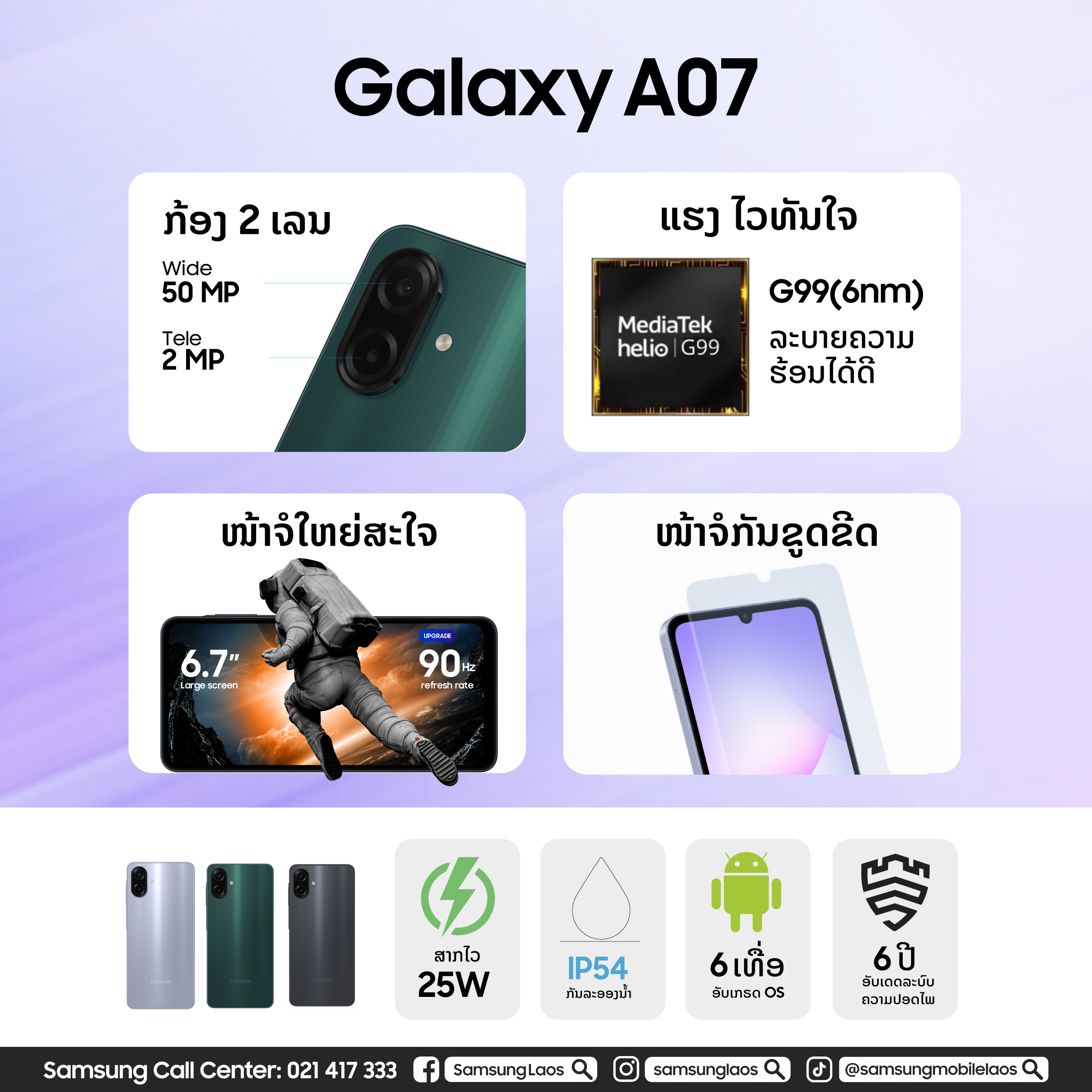 Galaxy A07 ມີໃຫ້ເລືອກ 3 ສີຄື: ສີມ່ວງ, ສີຂຽວ ແລະ ສີດຳ, ເລີ່ມຕົ້ນທີ່ລາຄາ 1,999,000 ກີບ.
