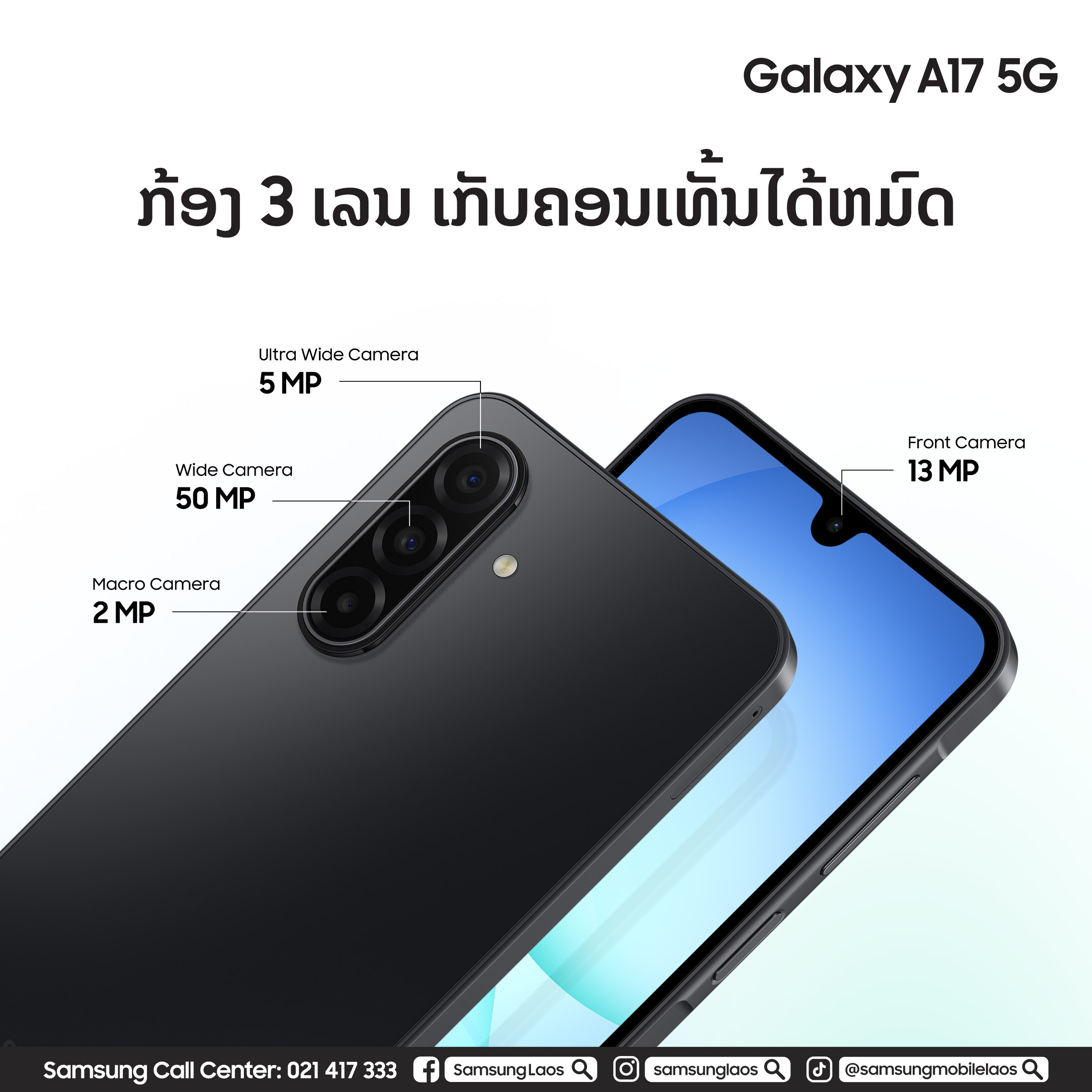 Galaxy A17 5G ມີໃຫ້ເລືອກ 2 ສີຄື: ສີຟ້າ ແລະ ສີດຳ, ເລີ່ມຕົ້ນທີ່ລາຄາ 5,299,000 ກີບ.