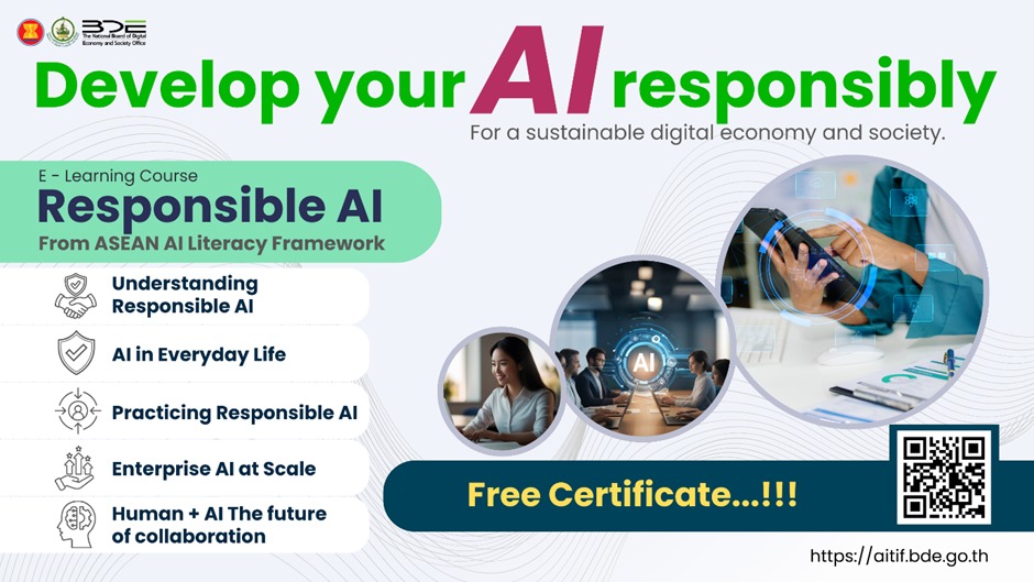 ຮ່ວມສ້າງນະວັດຕະກຳທີ່ມີຈັນຍາບັນ: ພວກເຮົາຂໍເຊີນທ່ານເຂົ້າຮ່ວມໂຄງການອົບຮົມອອນລາຍໃນຫຼັກສູດ Responsible AI. ຮຽນຮູ້ນຳໃຊ້ພະລັງຂອງເຕັກໂນໂລຊີຢ່າງມີປະສິດທິພາບ ພ້ອມທັງຮັບປະກັນຄວາມປອດໄພ, ຄວາມໂປ່ງໃສ ແລະ ກວດສອບ ໄດ້ທີ່: https://aitif.bde.go.th/
